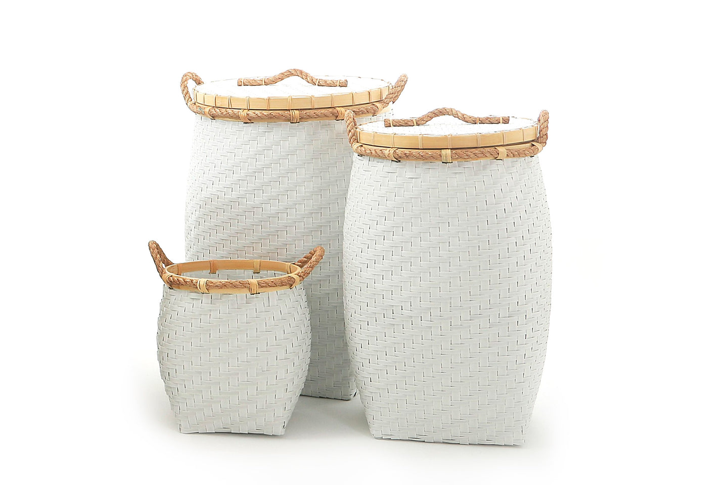 Canasto c/tapa blanco l siput. Tejido en rattan sintético, agarraderas en cabuya naútica con detalles en bambú.
