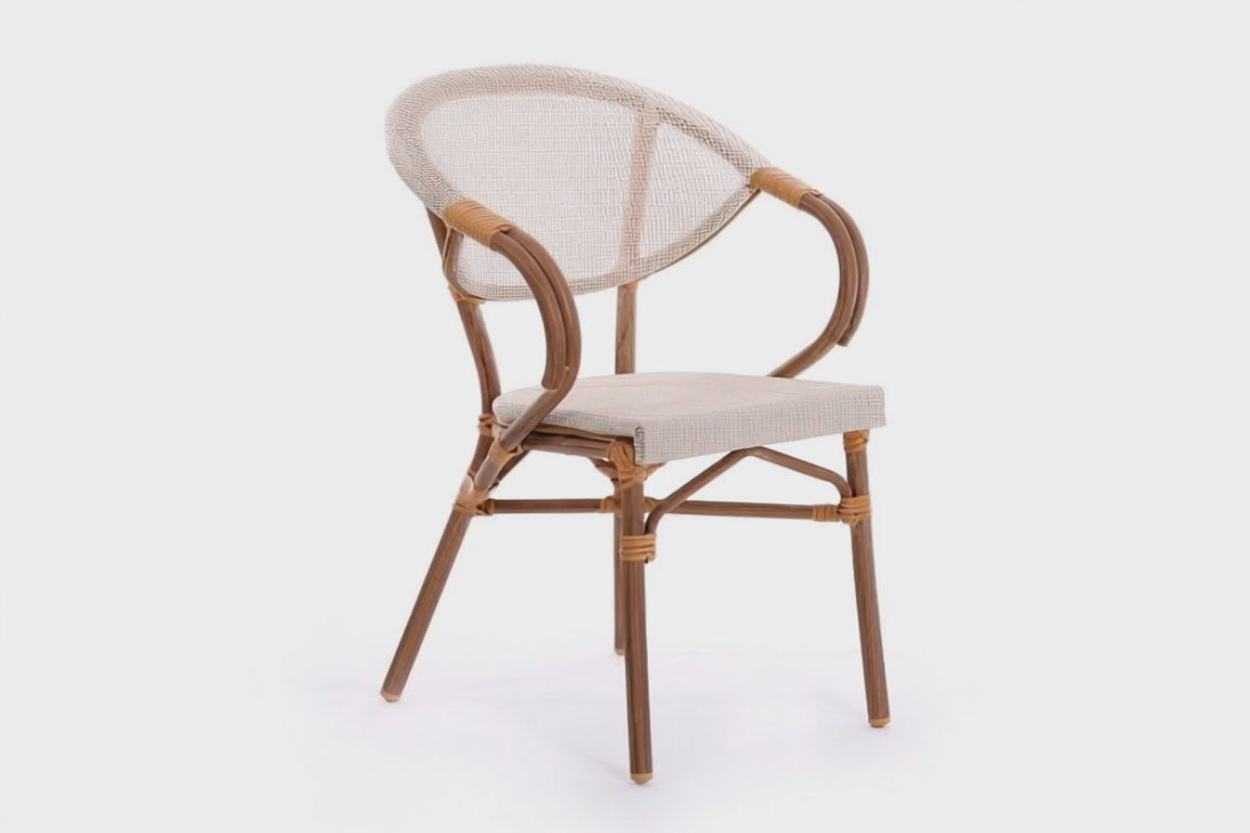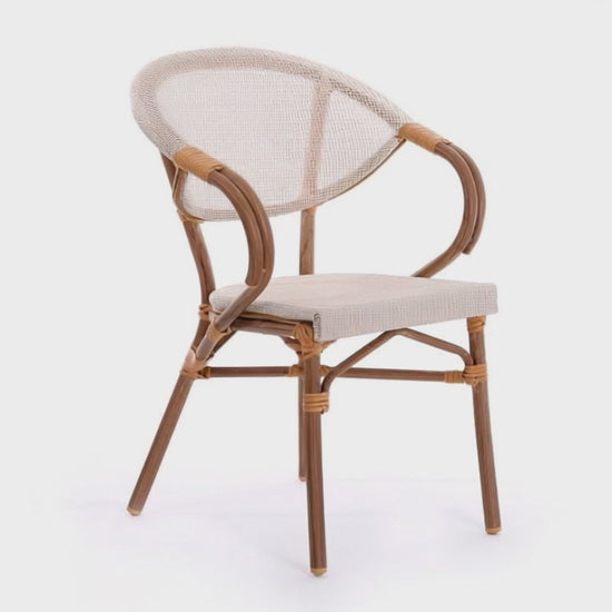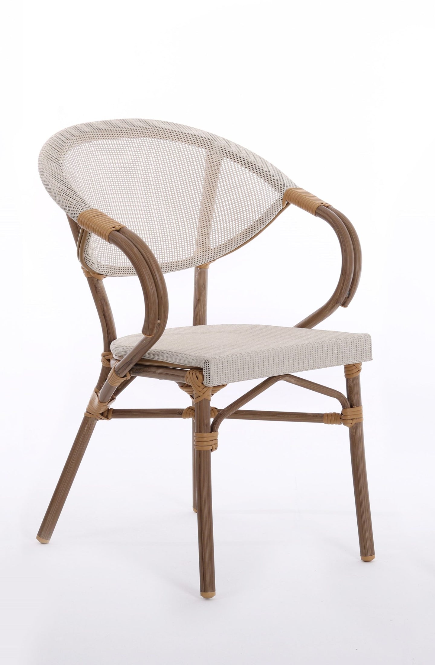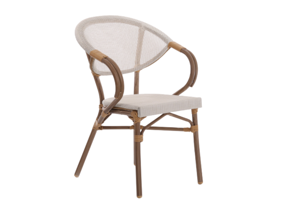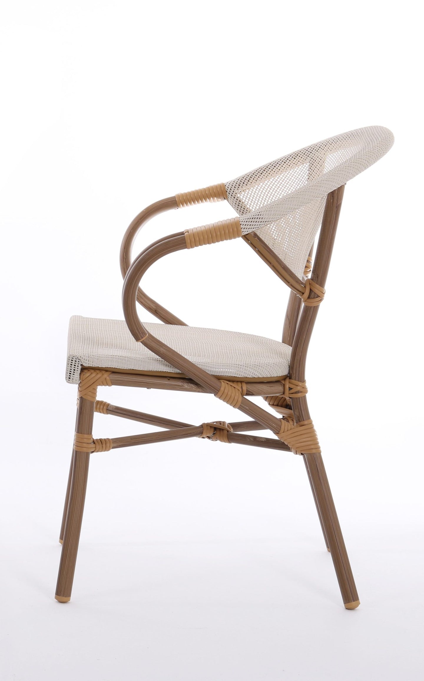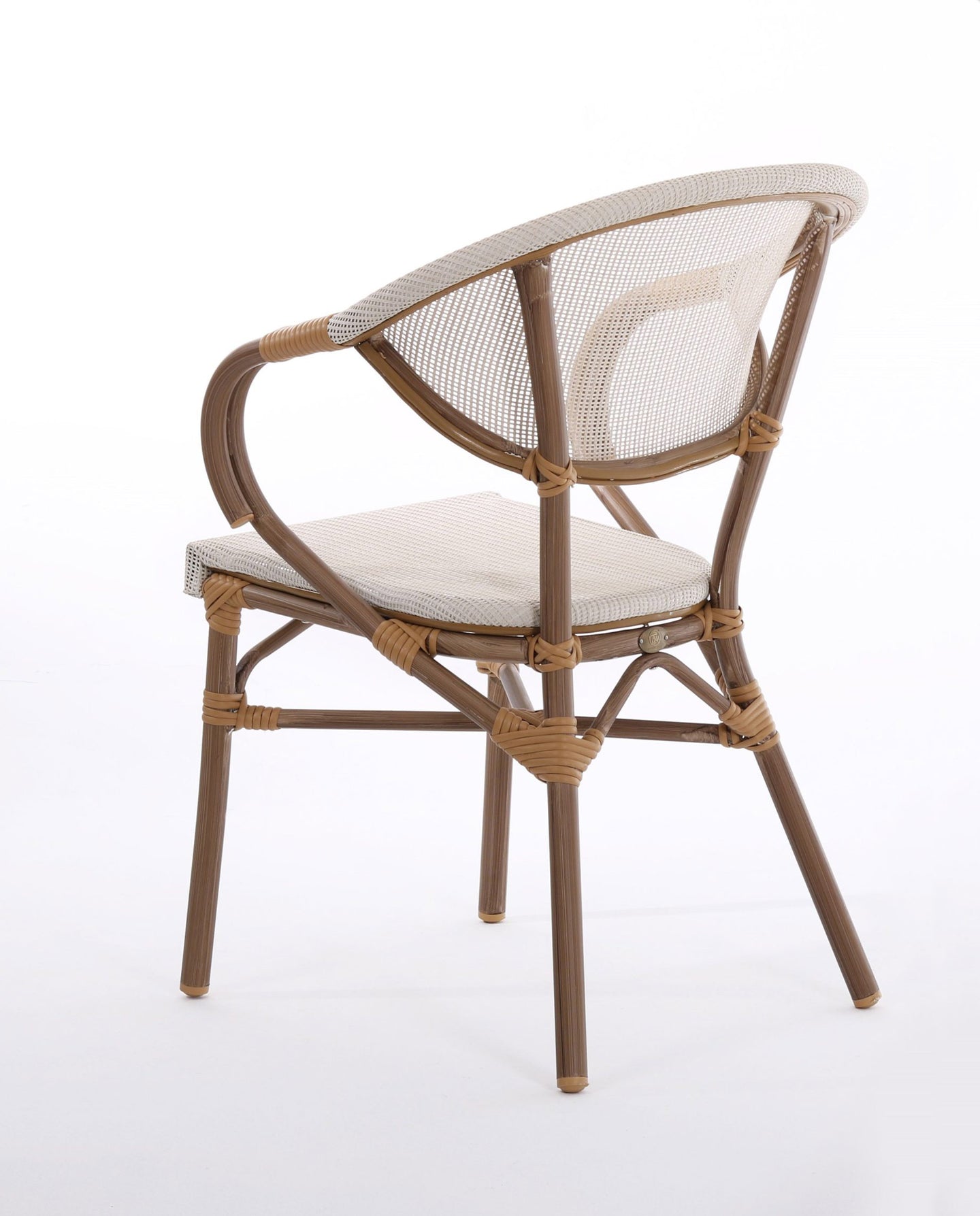 Silla comedor con brazos crudo starbucks. Estructura en aluminio, sentadero y espaldar en textileno. Nudos en rattan sintético. Apilables de a 10 unidades.