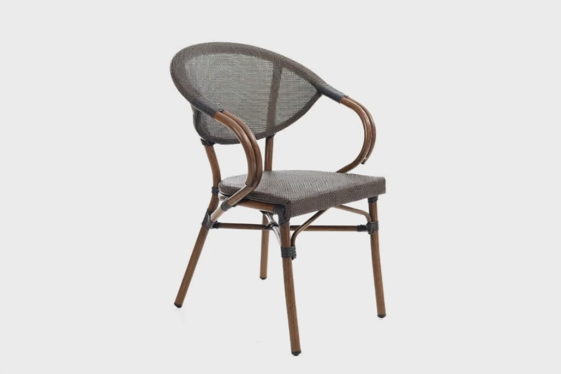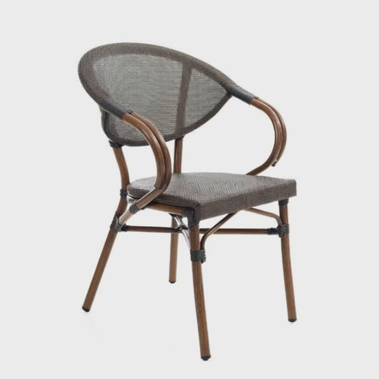 Silla comedor con brazos negra starbucks. Estructura en aluminio, sentadero y espaldar en textileno. Nudos en rattan sintético. Apilables de a 10 unidades.