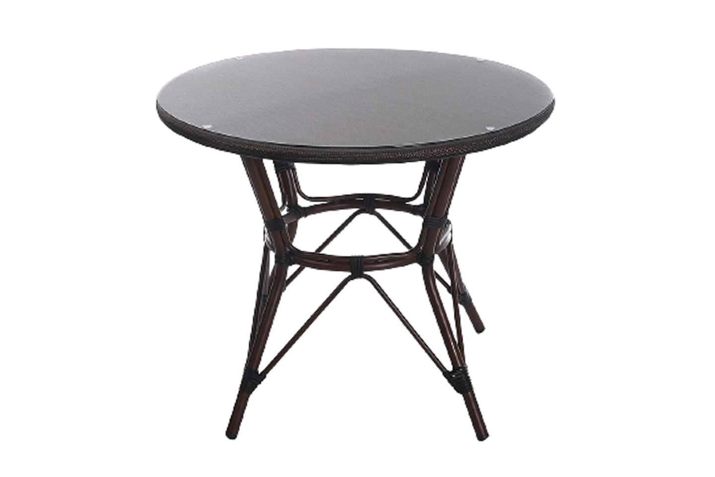 Mesa comedor d-90 negra con vidrio starbucks. Estructura en aluminio, superficie de la mesa en textileno.
