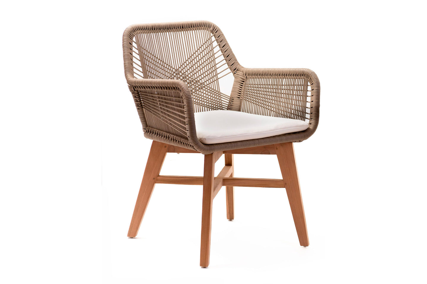 Silla comedor con brazos taupe intemp tiga. Estructura en aluminio, tejido en lazo sintético. Patas en madera teca.