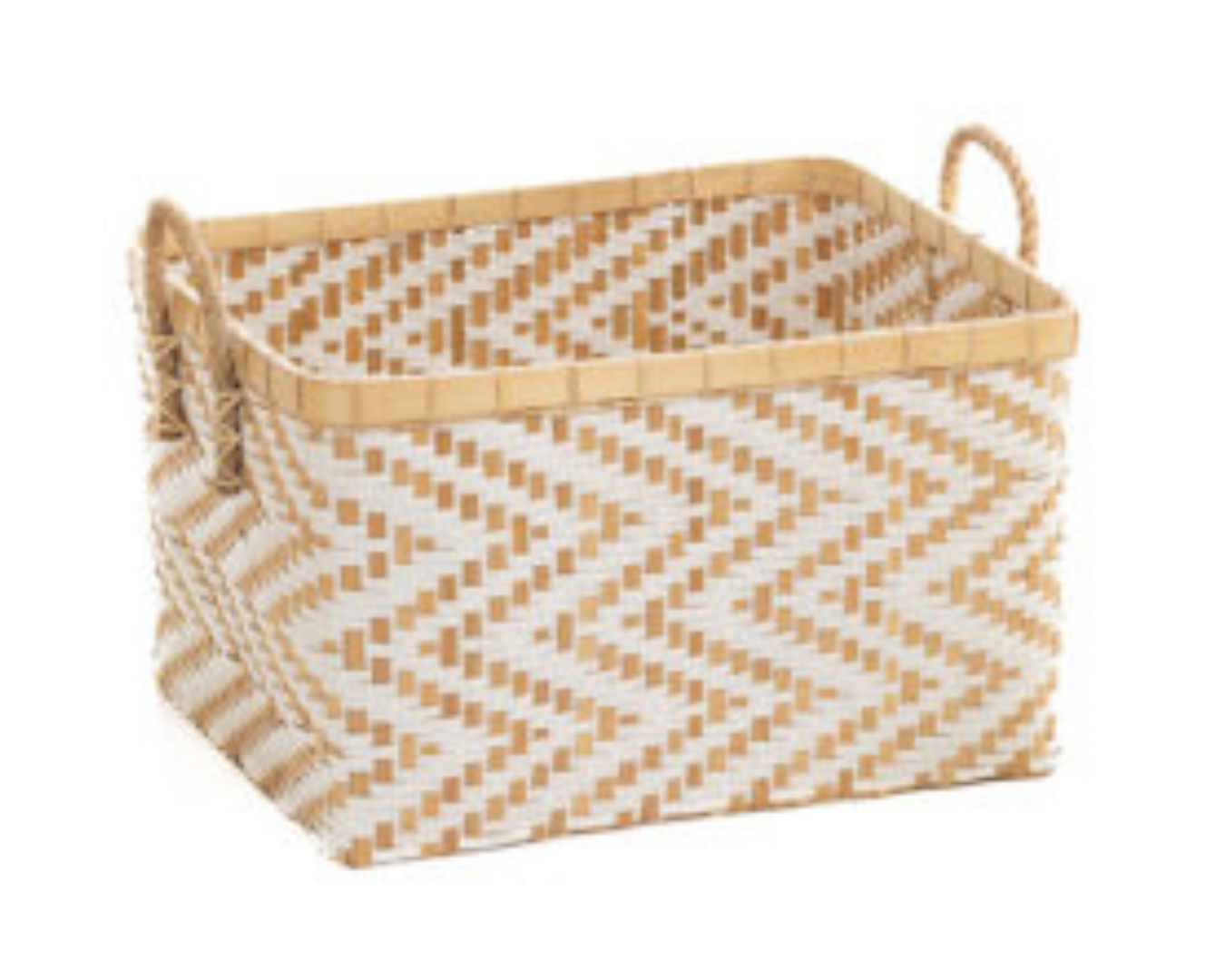 Canasto rect con agarradero b/nat s toki. Canasto tejido en rattan natural y rattan sintético, detalles en bambú y agarraderas en cabuya náutica.