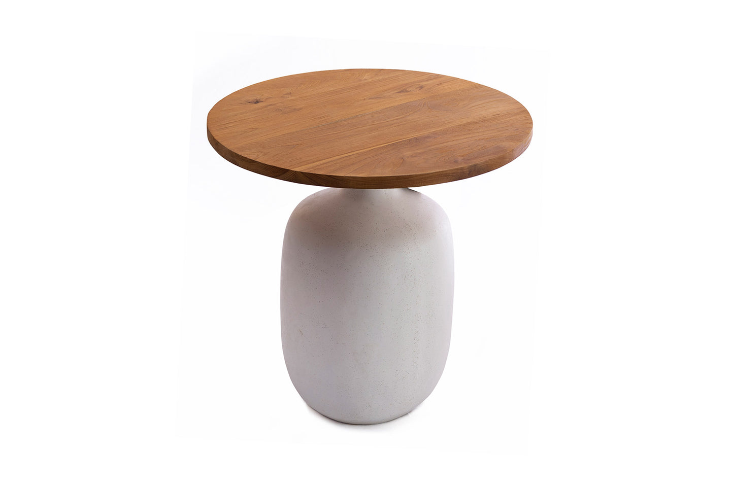 Mesa auxiliar diam 50x51cm blc verbena. Pieza elaborada en microcemento, superficie en madera teca.