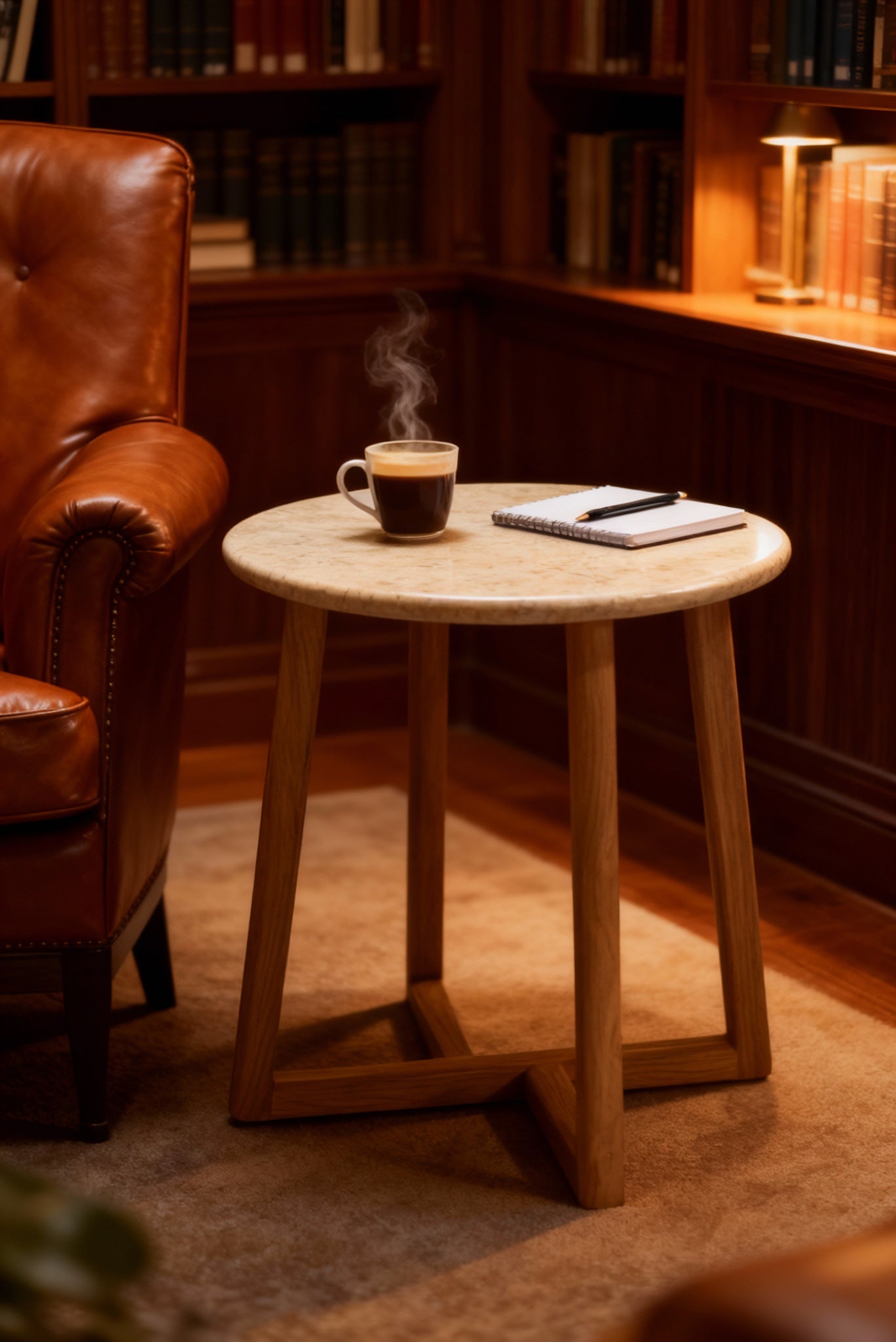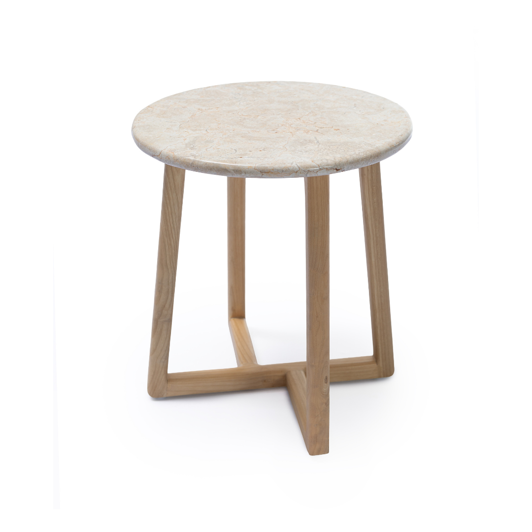 Mesa auxiliar diam 40 x 45 Zeny. Elaborada en madera sungkai con superficie en mármol